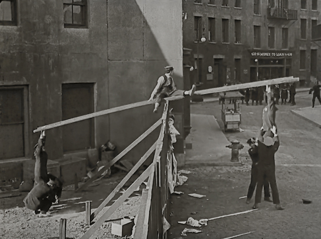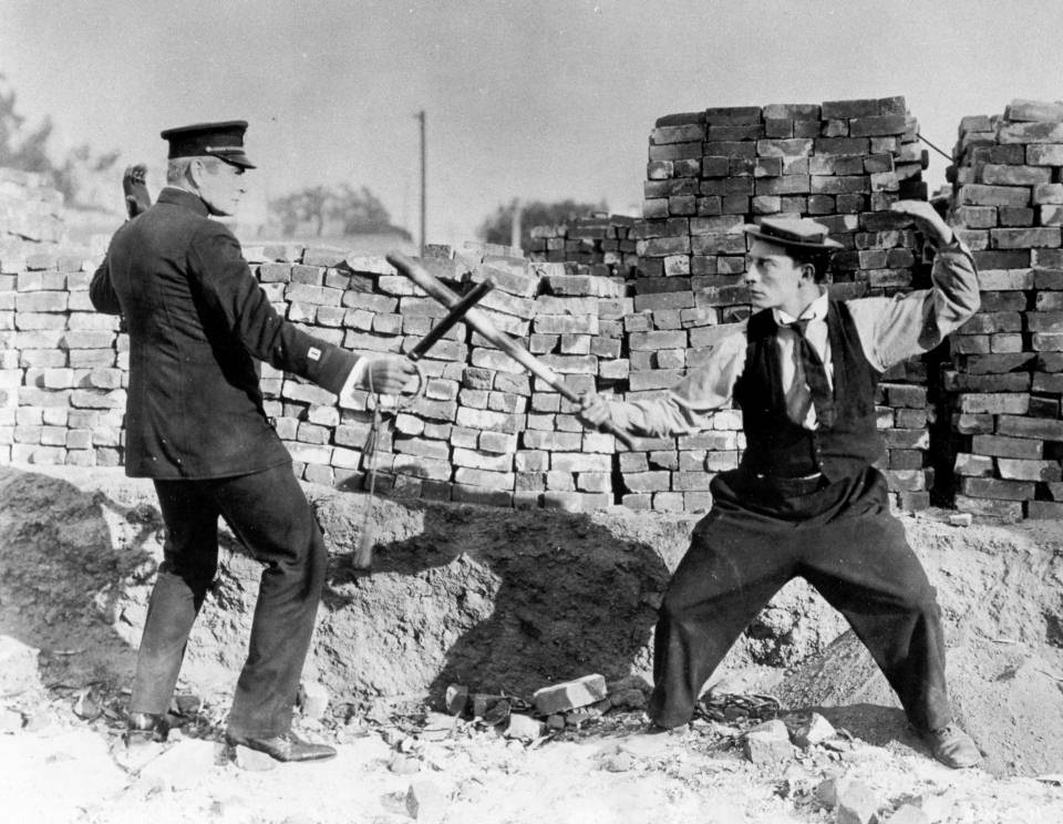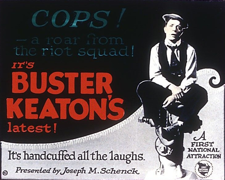 На этой повозке Бастер случайно присоединяется к колоссальному полицейскому параду. Полицейские, как представители власти, были любимой мишенью кинокомедии с момента ее зарождения - особенно пышно это направление расцвело на студии "Кистоун" Мака Сеннета в середине 1910х, где нелепые усатые полицейские превратились в настоящую комическую группу. Сам Бастер рассуждал, что это поставить полицейского в неудобное положение и показать его нелепым особенно приятно и смешно как раз потому, что полицейский наделен властью. Но ни до, ни после Китона никто не доводил ситуацию до таких масштабов - копы у него заполоняют экран и весь город, превращая следующую за парадом погоню в кошмарное, сюрреалистическое зрелище. Надо сказать, шутить про копов на тот момент было уже не так уж безопасно - иногда цензурные комитеты требовали вырезать сцены, насмехающиеся над слугами закона - "Копам" Китона в таком случае не светило ничего хорошего, что его изрядно веселило.