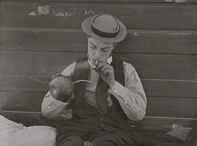 Китон завершает "Копов" очень своеобразно - удавшейся попыткой самоубийства, внезапной и плохо вообразимой в комедии смертью главного героя (то есть себя). Не все его фильмы, начиная с дебютной "Одной недели", заканчиваются действительно хорошо, а почти все счастливые концовки, если в них вдуматься, несут оттенок горечи, но только здесь Китон, всегда любивший черный юмор, впервые решился увенчать свою историю надгробием (в фирменной плоской шляпе, конечно). Видя, как его любовь смеется над его победой - и замком, под который он посадил всю городскую полицию - преодолевший все препятствия на своем пути, но все-таки отвергнутый и разочарованный Бастер сам выбирает небытие.