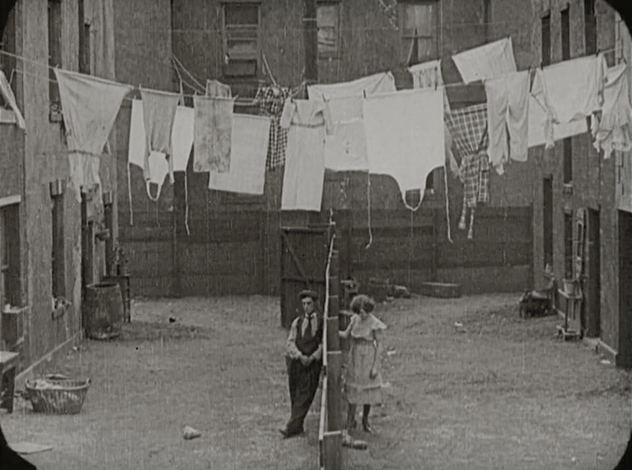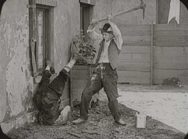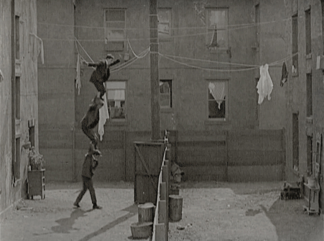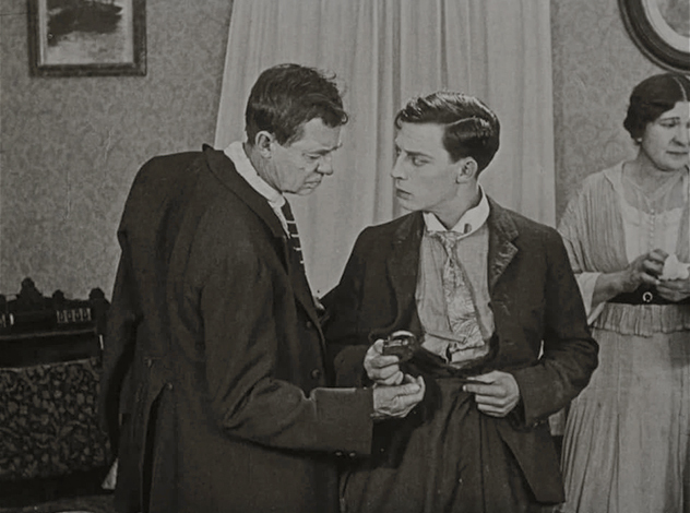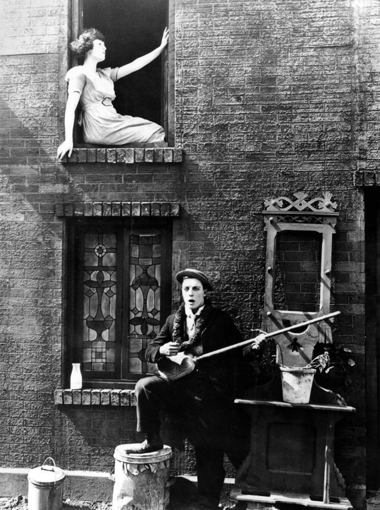 Шекспировский сюжет о Ромео и Джульетте в руках Китона превратился в эффектное упражнение по композиции, сценографии и работе с пространством. Романтический интертитр о Цветке Любви в Саду Мечты предваряет идеально симметричный кадр нищего двора, затянутого веревками с бельем, с разлученными влюбленными, с двух сторон подпирающими забор. Показывая двор дальним планом вместе с обрамляющими домами, Китон использует его как театральную сцену и наполняет огромным количеством деталей, требующим от зрителя внимания. Имитация сцены позволяет ему опереться на театральный опыт и использовать водевильные гэги, например, передаваемую через дырку в заборе любовную записку, каждое перемещение которой сопровождается появлением новых ревнивых свидетелей и подозрений. Интересно, что сам Китон в гэге почти не участвует, делясь с другими актерами экранным временем и возможностью рассмешить.