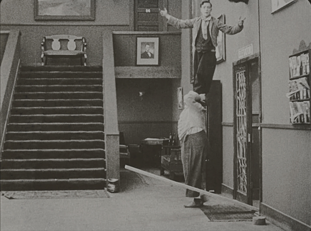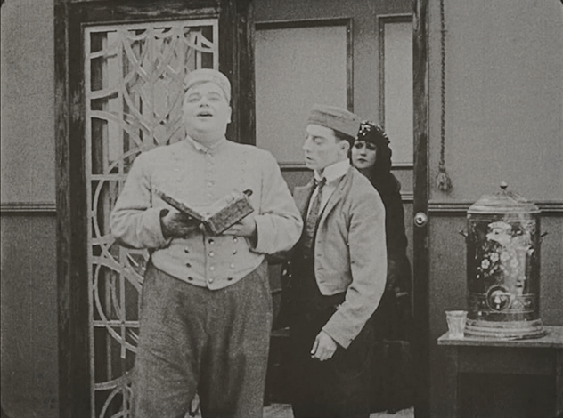 "штатом гэгменов в одном лице" и сорежиссером, который не только контролировал съемочный процесс из-за камеры, пока Роско был в кадре, но и вносил в фильм собственные идеи. Очень похоже, что как раз тут этот момент настал — даже в композиции интерьерных кадров кое-где мелькает будущая китонская маниакально-дотошная симметрия.