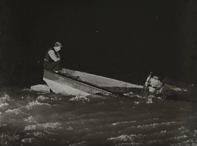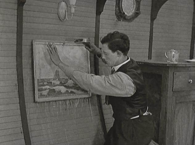 В конце концов семья, оставшаяся не только без дома, но и без машины (ее Бастер топит в процессе перевозки), все-таки доставляет свою лодку к реке и пытается спустить ее на воду, но та притворяется субмариной и уходит на дно вместе со своим незадачливым капитаном. Эта сцена стала одним из самых тяжелых испытаний для арт-директора и правой руки Китона, Фреда Габури, который помогал ему решать сложные технические задачи. Для фильма было построено две похожих лодки - одна из них должна была плавать в основной части фильма, а другая - тонуть в этой сцене. Однако, нагруженная железным ломом лодка для затопления тонуть отказывалась - лом проламывал обшивку и уходил на дно, а сама лодка тут же всплывала. В конце концов Габури с ней справился, утащив ее на дно стальными тросами с помощью лебедки. Зато другая, плавательная лодка, наоборот, изрядно пропускала воду и кренилась на один борт, так что в итоге членам команды пришлось сидеть в трюме и откачивать воду насосами, чтобы Китон мог продолжать съемки. Отдельной изюминкой фильма стала симметричная "Одной Неделе", сцена шторма - для нее Габури соорудил крутящийся павильон, подобного которому до этого, кажется, в кино еще не появлялось, и который, похоже, очень приглянулся Кристоферу Нолану.