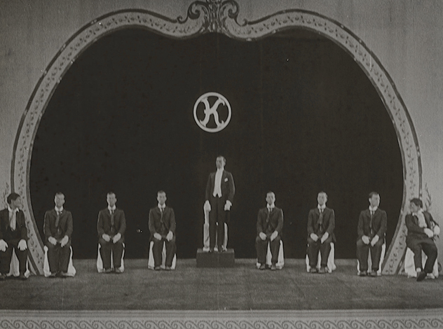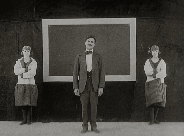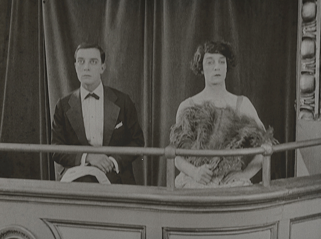 Первые пять минут в "Театре" не показывают никого, кроме самого Бастера. Китон играет рабочего сцены, шестерых зрителей, шестерых музыкантов, дирижера оркестра, двух синхронных танцоров и девятерых участников шоу менестрелей одновременно (если верить Клайду Брукману, способ создания беспрецедентной девятикратной мультиэкспозиции для шоу менестрелей Бастер изобрел лично). Мало того, Китон не стесняется открыто шутить про самого себя: скучающий в ложе Бастер-зритель смотрит в программу представления, где все роли, включая технические и вовсе выдуманные (в их числе есть, например, "Спящий в глубине" - название популярной тогда песни, намекающее на истинное состояние Бастера в этот момент) исполняет Бастер Китон. Так, по его словам, он подшучивал над продюсером и режиссером Томасом Инсом, якобы любившем указывать свое имя в титрах во всех возможных местах; но легко предположить, что зритель видел в этом скорее насмешку над Чаплином (незадолго до "Театра" на экраны вышел его первый полнометражный фильм "Малыш", в титрах которого происходило ровно то же самое). Озадаченно почесав в затылке, Бастер сообщает своей "спутнице" - тоже, разумеется, Бастеру, коронную фразу: "Кажется, этот Китон и есть все шоу" (выражение было популярным рефреном у прессы, писавшей о выступлениях маленького Бастера в водевиле).